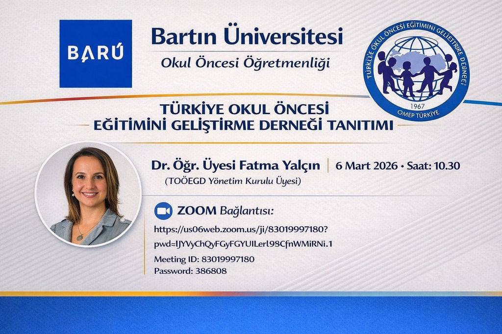 Okul Öncesi Öğretmen Adaylarımız, Dr. Öğr. Üyesi Fatma Yalçın’ın sunumuyla Türkiye Okul Öncesi Eğitimini Geliştirme Derneği ile bir araya geliyor. Etkinlik, 6 Mart 2026 tarihinde saat 10.30’da çevrim içi olarak gerçekleştirilecektir. Tüm öğretmen adaylarımızın katılımını bekleriz.